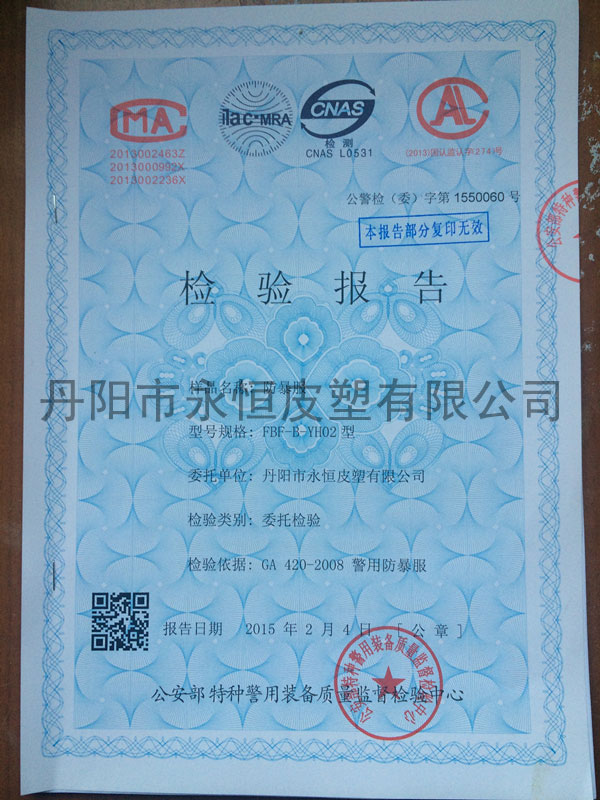 本司防暴服已通過2015公安部特種裝備質量監督檢驗中心的檢測